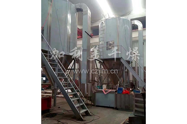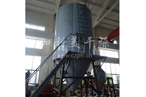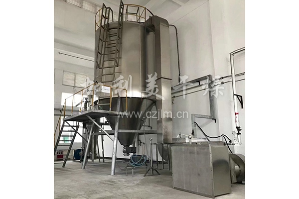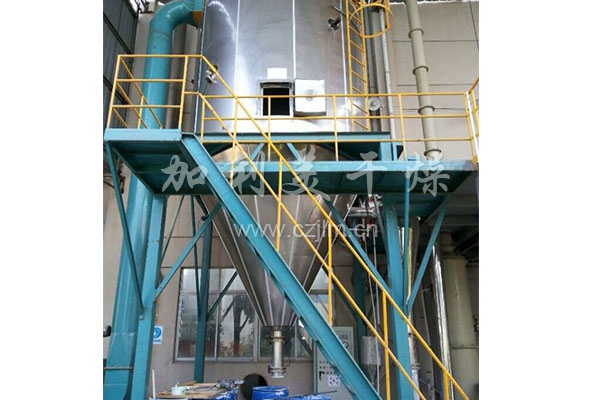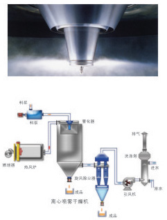 空氣經(jīng)過過濾和加熱,進入干燥器頂部空氣分配器,熱空氣呈螺旋狀均勻地進入干燥室。料液經(jīng)塔體頂部的高速離心霧化器,(旋轉(zhuǎn))噴霧成極細微的霧狀液珠,與熱空氣并流接觸,在極短的時間內(nèi)可干燥為成品。成品連續(xù)地由干燥塔底部和旋風分離器中輸出,廢氣由風機排空。