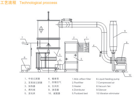 物料粉末粒子,在原料容器(流化床)中呈環(huán)形流化狀態(tài),受到經(jīng)過(guò)凈化后的加熱空氣預(yù)熱和混合,將粘合劑溶液霧化噴入,使若干粒子聚集成含有粘合劑的團(tuán)粒,由于熱空氣對(duì)物料的不斷干燥,使團(tuán)粒中水分蒸發(fā),粘合劑凝固,此過(guò)程不斷重復(fù)進(jìn)行,形成理想的、均勻的多微孔球狀顆粒。